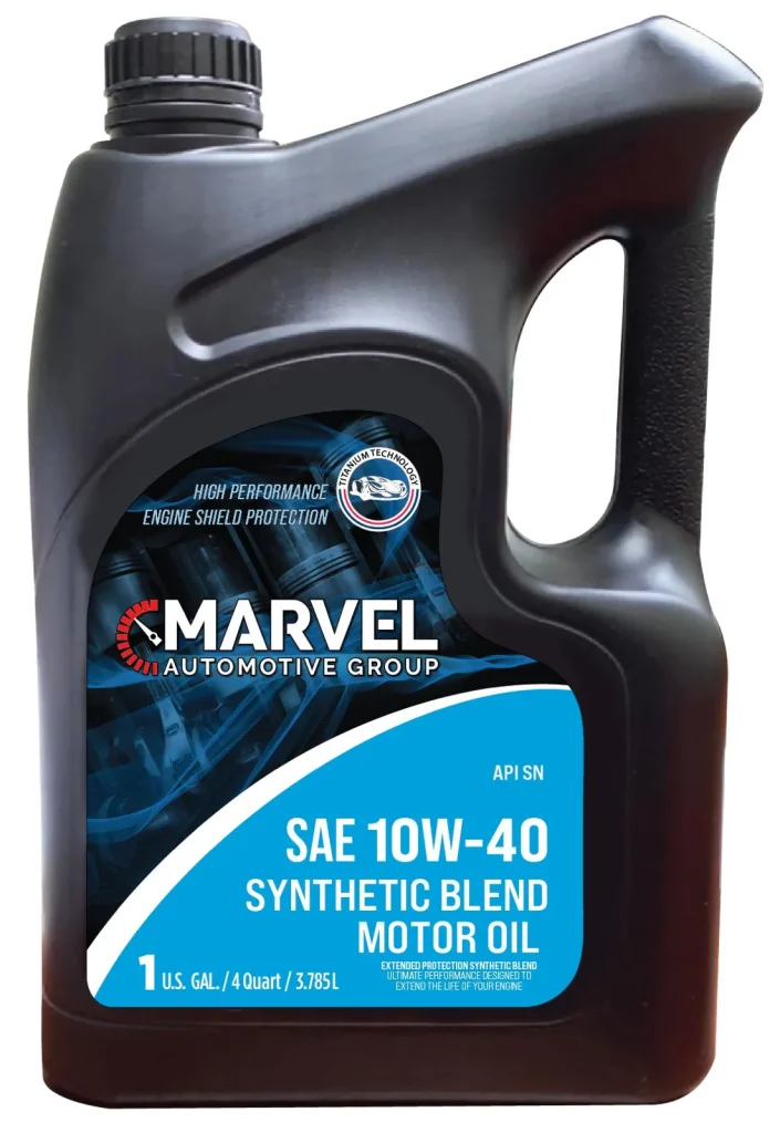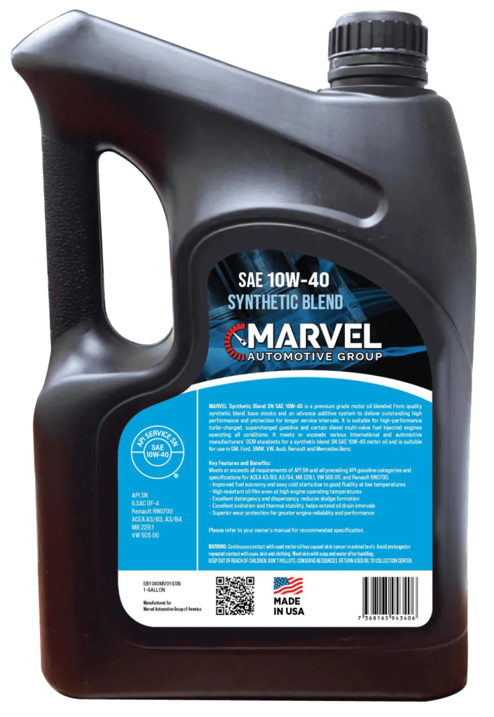 MARVEL Synthetic Blend SN SAE 10W-40 is a premium grade motor oil blended from quality synthetic blend base stocks and an advanced additive system to deliver outstanding high performance and protection for longer service intervals. It is suitable for high-performance, turbo-charged, supercharged gasoline and certain diesel multi-valve fuel injected engines operating all conditions. It meets or exceeds various International and automotive manufacturers’ OEM standards for a synthetic blend SN SAE 10W-40 motor oil and is suitable for use in GM, Ford, BMW, VW, Audi, Renault and Mercedes Benz.